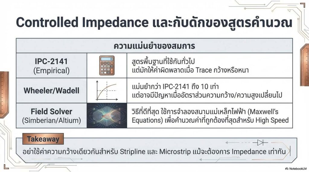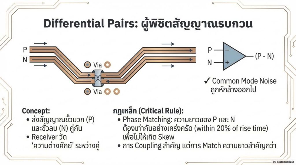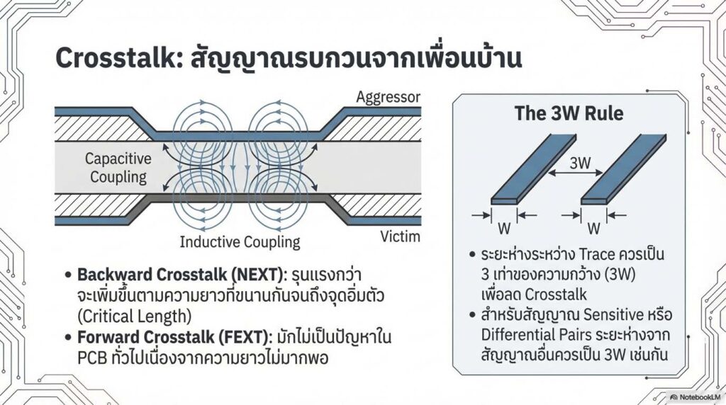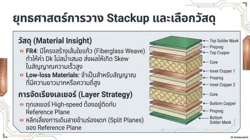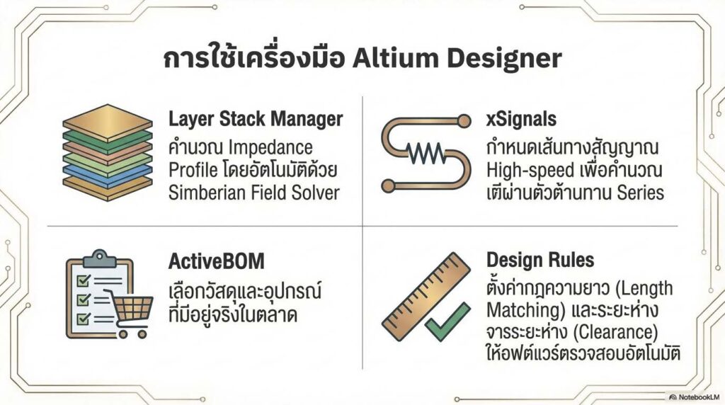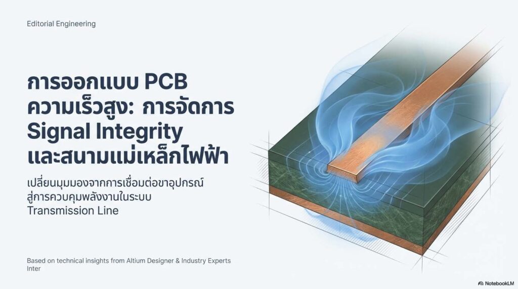 การออกแบบแผงวงจรพิมพ์ (PCB) ความเร็วสูง โดยเน้นไปที่การรักษาความสมบูรณ์ของสัญญาณและการจัดการโครงสร้างเลเยอร์อย่างมีประสิทธิภาพ เนื้อหาครอบคลุมเทคนิคที่สำคัญ เช่น การควบคุมค่าอิมพีแดนซ์ การจัดการปัญหาสัญญาณรบกวนข้ามสาย และการคำนวณความจุไฟฟ้าระหว่างเพลนเพื่อความเสถียรของพลังงาน นอกจากนี้ยังนำเสนอแนวทางปฏิบัติในการจัดวางเส้นวงจรแบบคู่ส่วนต่างและการใช้ เทคโนโลยี xSignals เพื่อปรับจูนความยาวเส้นทองแดงให้มีความแม่นยำสูงสุด ผู้เขียนยังเน้นย้ำถึงความสำคัญของการเลือกวัสดุลามิเนตและการตรวจสอบกระบวนการผลิตผ่านซอฟต์แวร์ Altium Designer เพื่อป้องกันข้อผิดพลาดจากโรงงานผลิต ทั้งหมดนี้มีเป้าหมายเพื่อให้ผู้ออกแบบสามารถควบคุมสนามแม่เหล็กไฟฟ้าและลดปัญหาการสะท้อนของสัญญาณในระบบอิเล็กทรอนิกส์สมัยใหม่ได้อย่างเป็นระบบในย่อหน้าเดียว